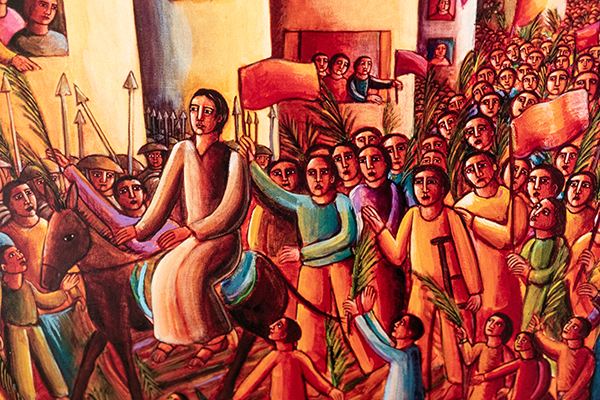 In addition to collecting many works by Mexican-American artist John August Swanson, Luther Seminary has Swanson’s personal papers, which include a variety of materials about the artist’s deep engagement with the Catholic Worker Movement. This painting depicts a vibrant yet ominous scene of Jesus entering Jerusalem on a donkey with many Roman soldiers nearby.